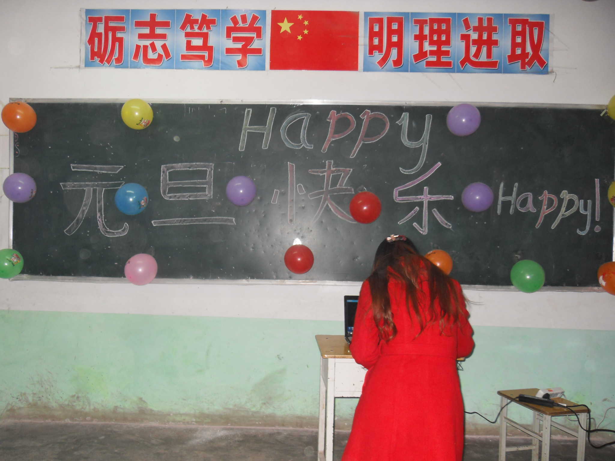 晚会开之前,部分同学打扫卫生,部分同学在布置教室。教室被布置的很漂亮。在黑板上、墙壁上、玻璃上都扎着五颜六色的气球,在黑板上写着“Happy New Year!”