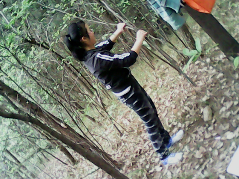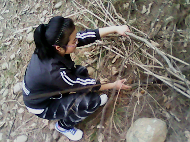 我马上开始了我的捡柴之旅。心想山上树木这么多,一定很容易就捡到干柴的。但是事情并不是我想象的那么简单,现在正值春天,有好多的树木都已经发芽了。树枝有很多水份,烧不燃。这可怎么办?天无决人之路,这么大的一片林子,还缺少柴吗。继续往前走,一定会有干柴的。我边走边看哪些地方有干柴,一路走过去,我只在地上捡了一小碎柴。咦~,我看见一根树枝光秃秃的,心想这个一定烧得燃。我用手轻轻的一扳,树枝就断了。