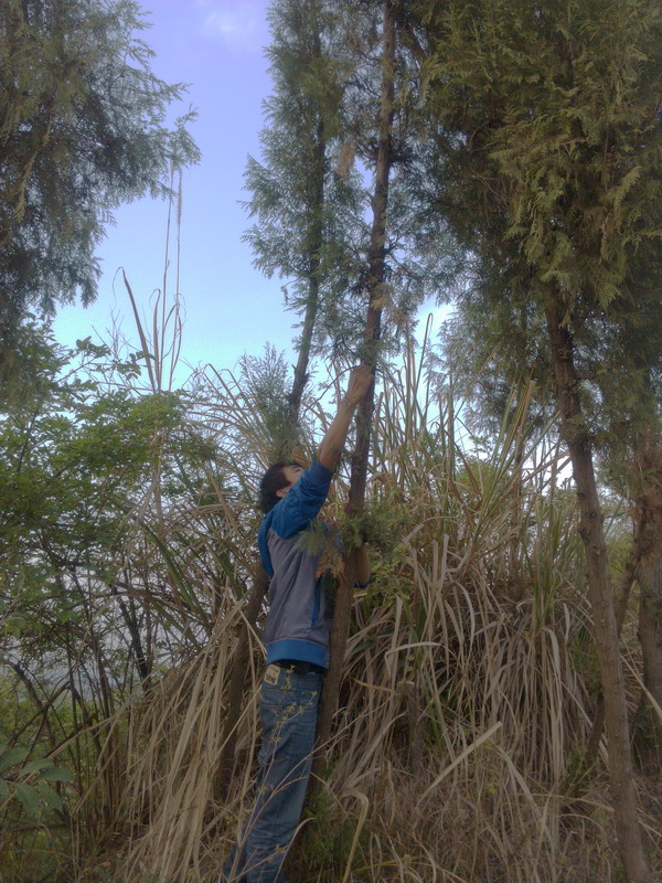 婆婆还告诉我说,在外面“游”的时候不要忘了摘一枝柏树枝插在头上。“百病”和“柏树”是两个谐音,所以就有了这样的习俗。特别是小孩子,头上插了柏树枝后来年就不会生病。就这样,我们摘了大把大把的柏树枝插在头上,装在帽子里,满上遍野的到处跑。在回家的时候还不忘把树枝带上。