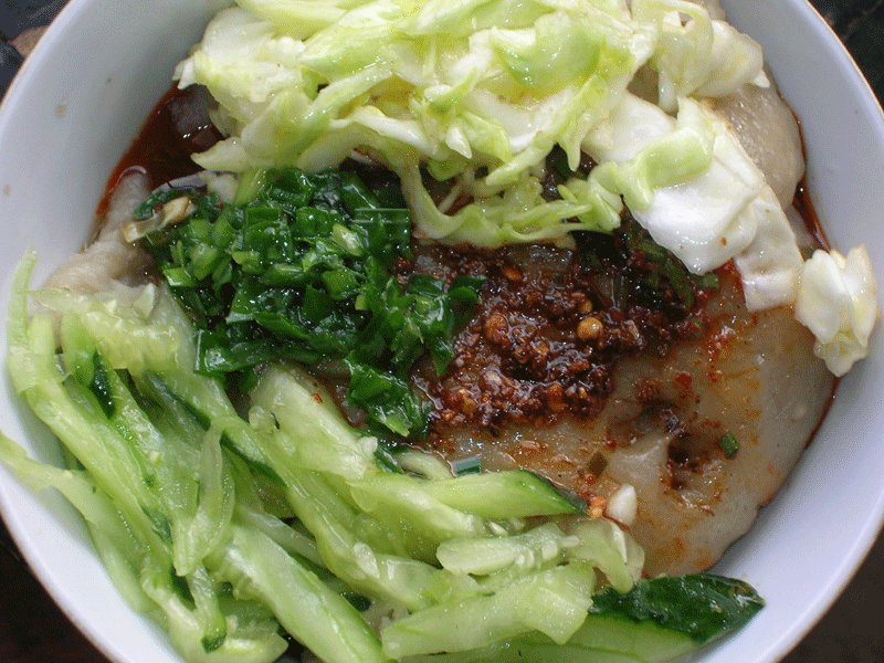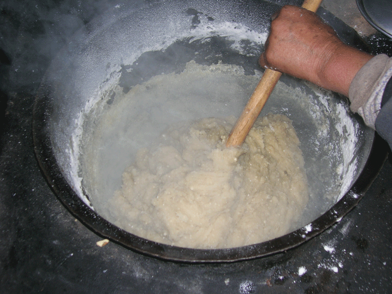 搅团是我们青海人的副食,吃搅团用的主要工具就是一根擀面仗,而且用这根擀面仗搅上后吃起来非常香,它的主要原料就是面、盐、开水。