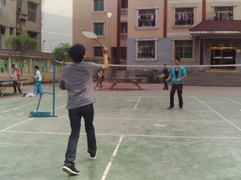 在女生打羽毛球的同时,还有男生打羽毛球的同学也在努力的练习。男生在打球的一开始挺有劲的,到了后面,跑得累了,没力气了,他们也还是在继续的练习。这是一次课外活动,所以同学们都很积极的参加,重再参与,不再结果。最重要的是要看我们有没有认真、努力地做。课外活动结束了,这次课外活动挺有意思的,练了球技,也放松了心情。