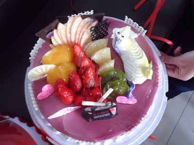 妈妈还给我买了一个大大的蛋糕,这是昨天妈妈和爸爸陪我一起去选定的。 这是一个全身涂满淡紫色蓝莓果酱的水果蛋糕。各种水果旁边窝着一匹肥壮的小马。爸爸说,那就是我,祝愿我茁壮成长。