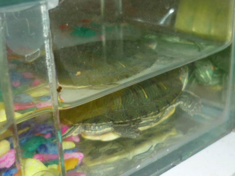 在这两只小乌龟中,一只活拨,一只懒惰,如同两类完全不同的人。懒的乌龟总是闭着眼睛,仿佛世界上的一切都不值得他睁开眼一般(呵呵,我说龟哥,你睡觉也不必装这么伟大吧!)。而另外一只乌龟则总是想爬出去似的(如果要你爬出去买鱼缸干吗?)。