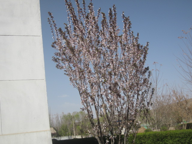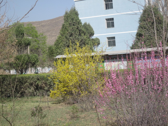 在刚进校门口的地方,有一个树上开满了许多粉红色的小花,在校门两旁的花园里,也有许多小花,有黄色的、粉红色的……