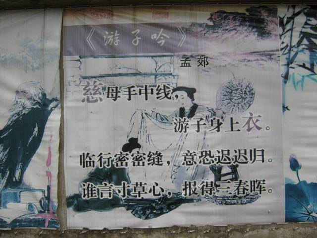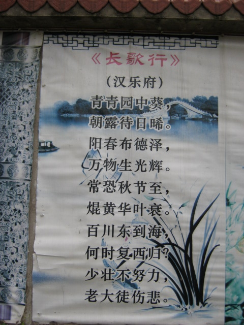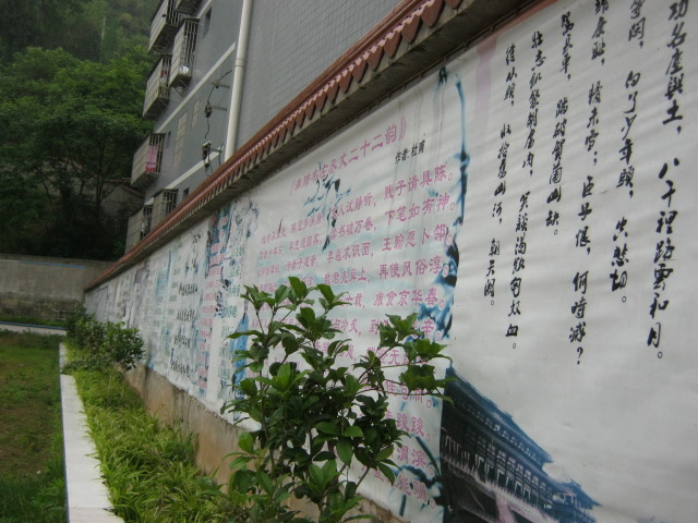 在校园东端有一块文化墙,其实是在隔离墙面上张贴了很多古人的诗词歌赋的字画,用来激励我们努力学习,教育我们成为国家有用之人。由于长期日晒夜露,鲜艳的画面有些褪色,但这不影响我们的学习欣赏。