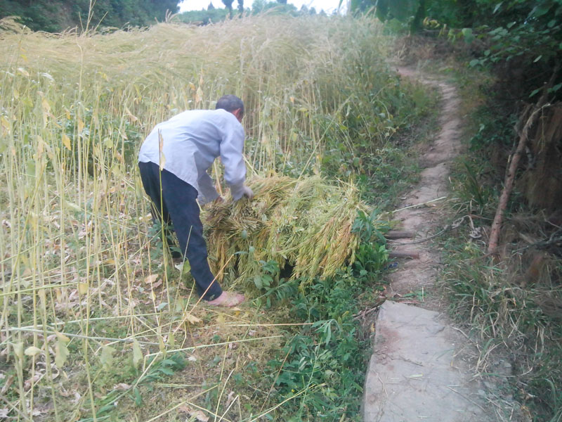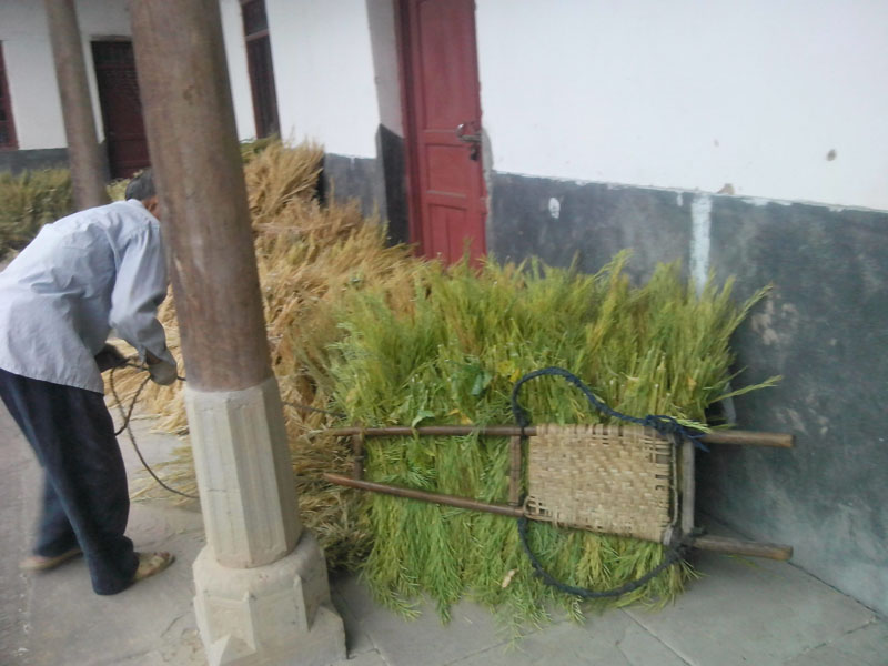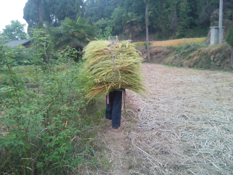 割完了油菜,还要把地里的油菜背回家。爷爷奶奶将割好的油菜捆绑成小把之后,放在地边,太阳照着油菜,把油菜稍微晒干一些,等到下午太阳落山,才肯背油菜回家。看起来没有多少油菜,背在背上还挺重的。首先,爷爷将捆好的油菜齐好放在"背架子"上面。还要放端,不放端背起就会掉。