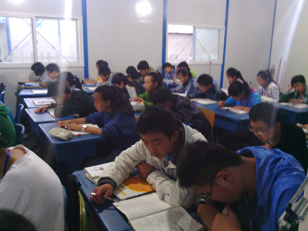 可是,在板房中,学生和教师们都要面对着炎热的天气,而且最艰难的是,板房搭得密,同学们在上课的时候,这个班在上什么课,相邻的班都听得见,相互影响很大。可就在这样的条件下,同学们并没有畏惧,而是和食堂一样在里面安心地上课。