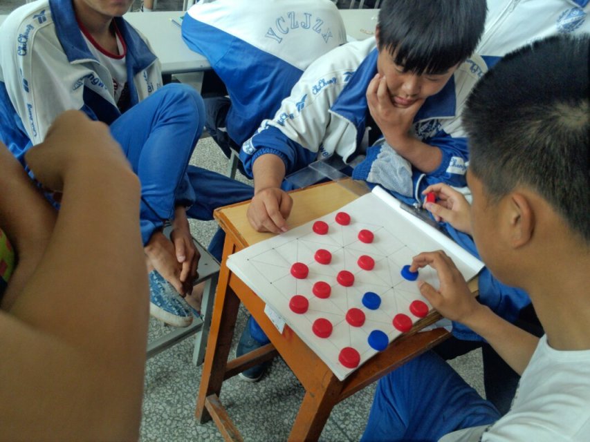 看着他们下的挺认真的。一个大田字格,上面有红,蓝两队。我看了半天才知道他们下的什么棋。