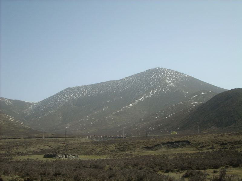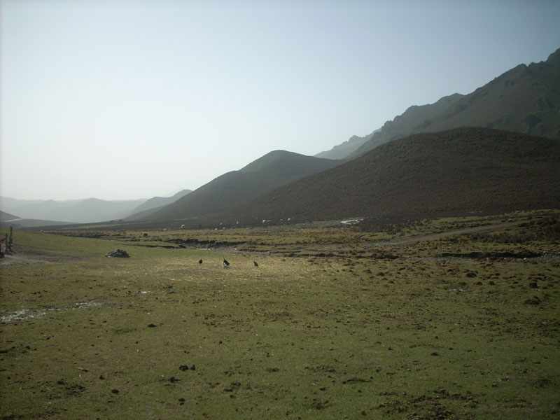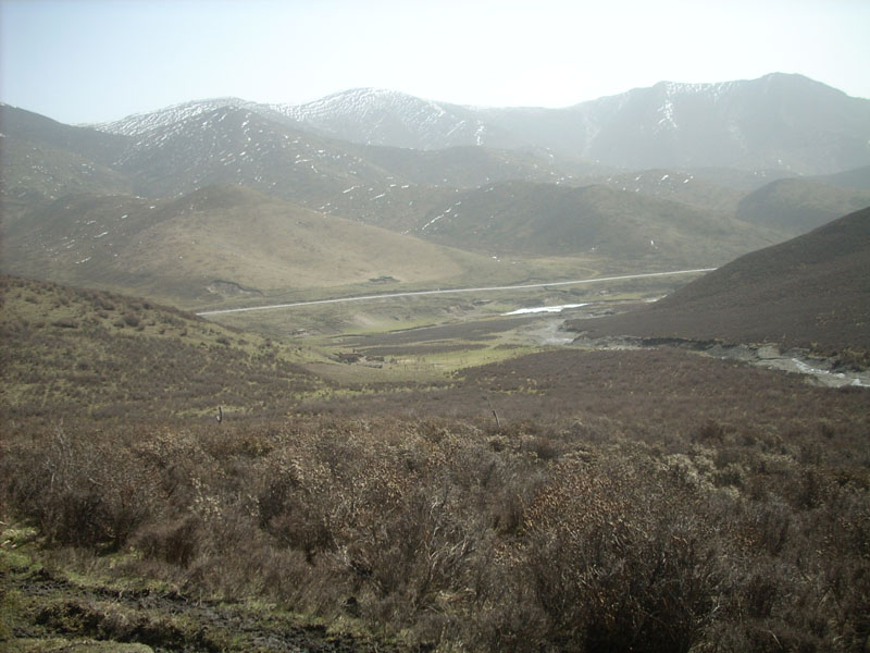 远处的山,白雪皑皑,近出茂盛的香柴高低起伏.山水相间,让人心旷神怡.