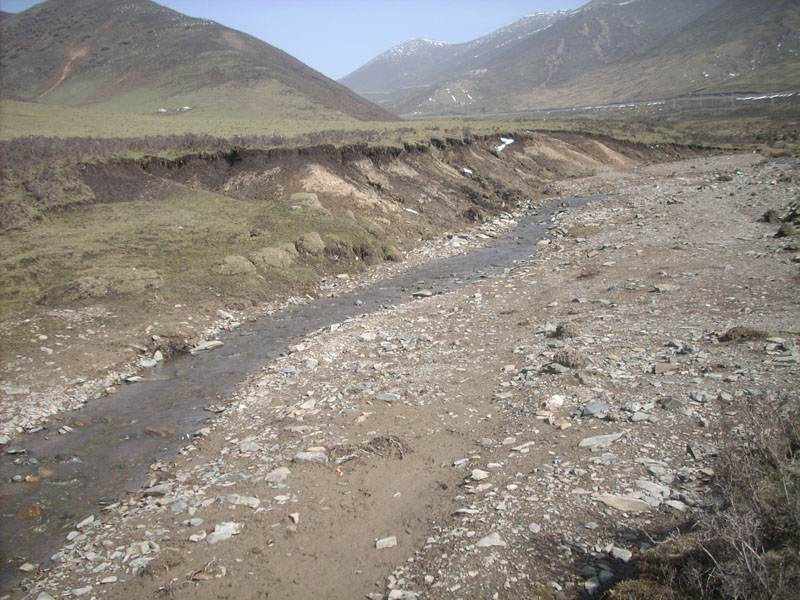 小河里的水静静的流向远方,只是寒冷的大地处处留下了冰雪初融的痕迹.