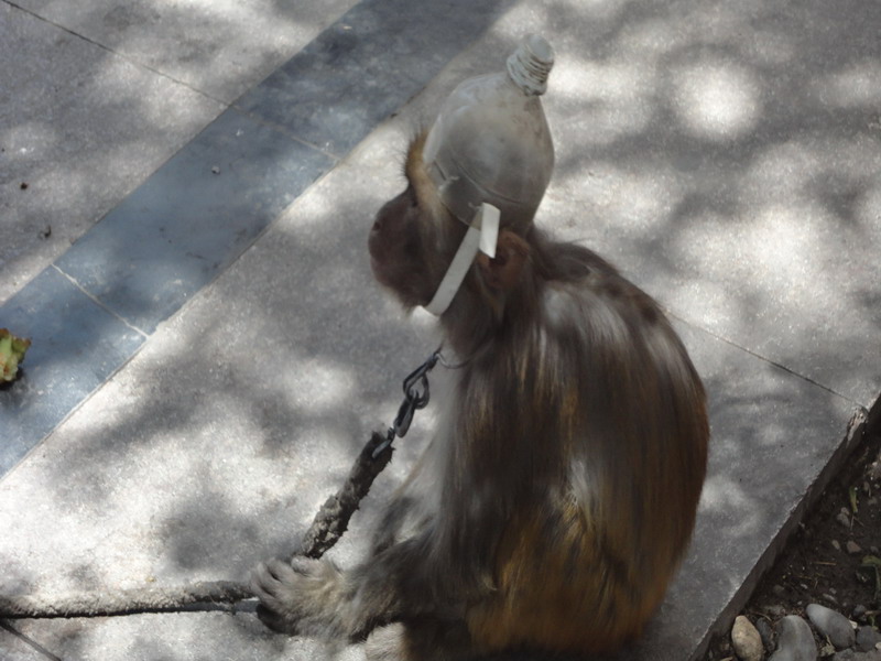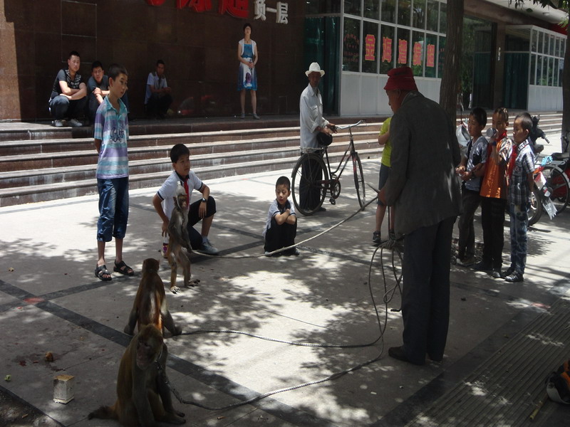 另外两只安静地蹲着,似乎还在熟悉周围的环境,它们也正等待着主人的“训练”,一轮番的表演结束后,这个中年人便摘下头顶的帽子向周围的人索要了一圈表演费,看过表演的人大多给了钱。之后,他便牵着三只猴子去另外的地方表演挣钱。