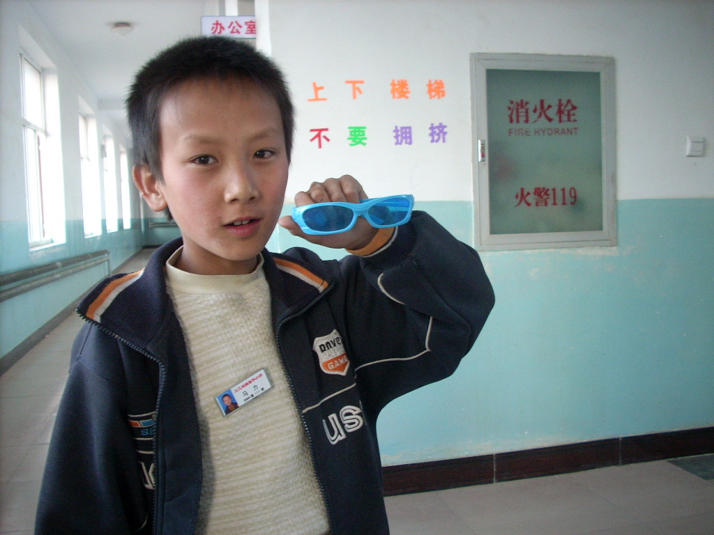 它的镜片是蓝色的,镜框是蓝色的,它是我的朋友,我经常带它在身上。