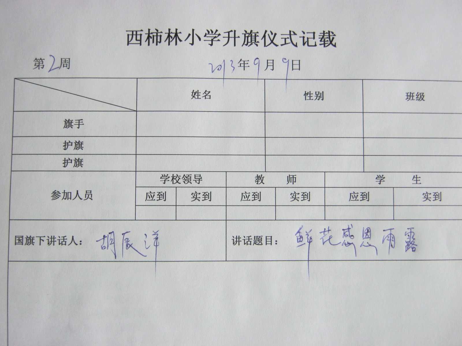 今天是开学的第二周,也是我们班进行晨会升旗仪式的第一次,上一周进行了简单的培训。当全校学生站着整齐的队伍立在广场,庄严的音乐声响起,我们班那几名旗手大方的来到旗杆下,麻利的进行着升旗,但终究还是不熟练,不能很好的掌握升旗的时间和速度,看来今后还要继续努力。