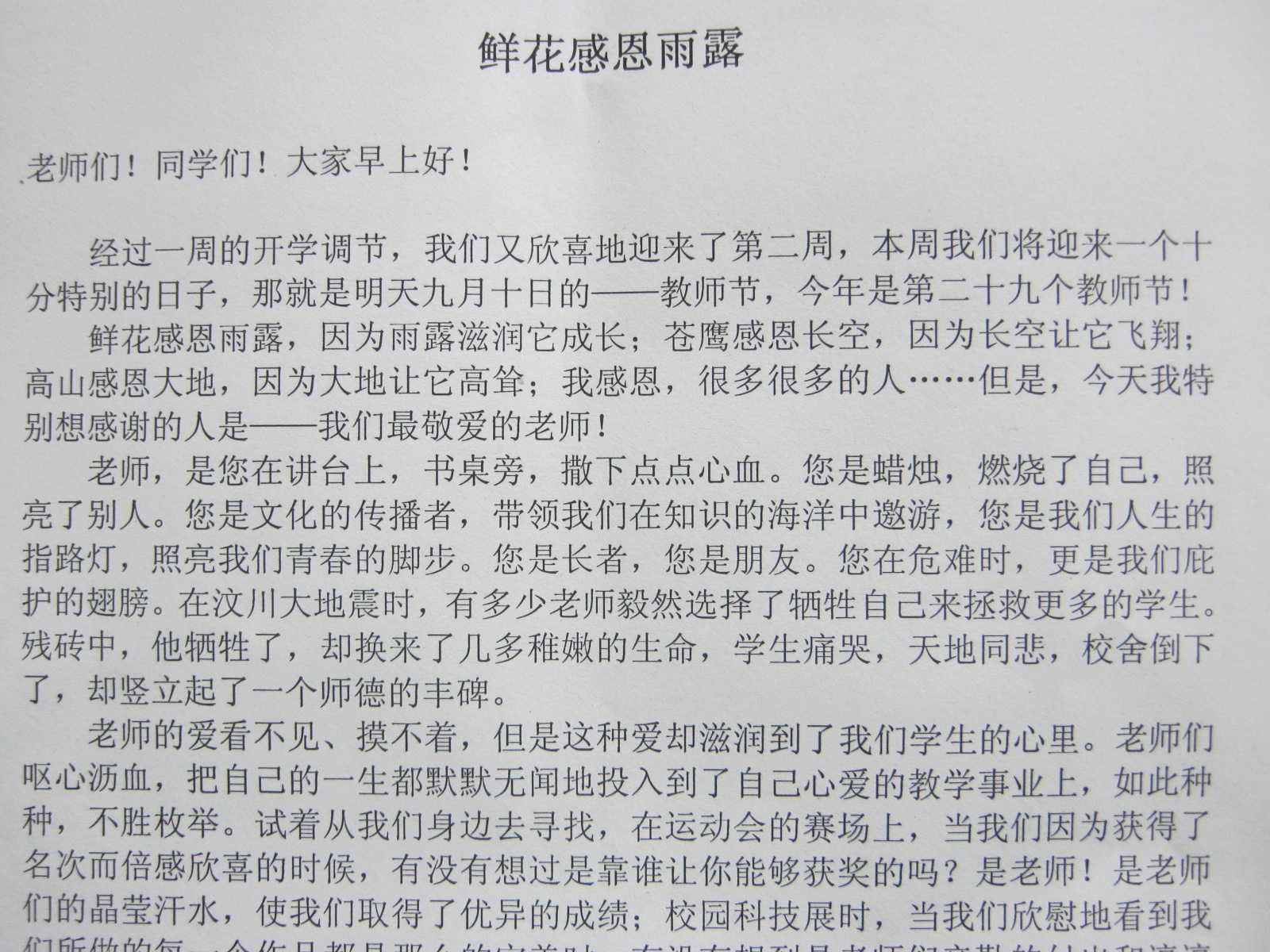 这一周国旗下演讲的是四年级的胡辰洋同学,她是她们班的班长,声音宏亮,举止大方。胡辰洋今天演讲的题目是《鲜花感恩雨露》,因为明天是九月十日——教师节。