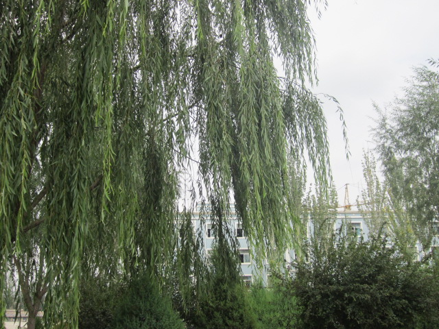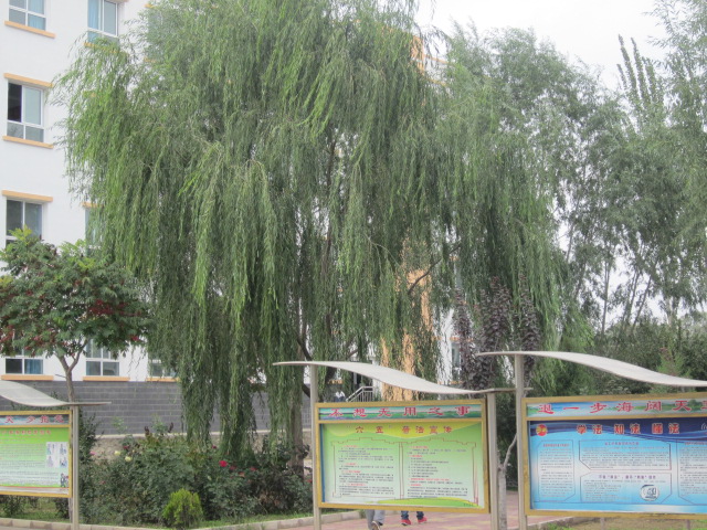 开学第一天,走入期待已久的校园,就看见了一颗大的垂柳。在学校中,这种树是随处可见的。在学校的花园中,就有一棵大的垂柳树。一直向下坠,在差不多就垂到了地面上,看他生长的速度,好像急着赶快去亲近大地一样。整个树都垂下来,看起来好像一幅画。