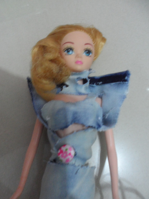 我把我的想法告诉了妈妈,妈妈很支持我的创意。并和我一起找来剪刀,针线盒,鼓励我,要认真做。我想了好半天,觉得,黑色的,应该做一个简单的,紧身的衣服,这样才会更精神,利索。拿着布子,在美芭比身上比划来比划去,我知道了下手的地方。其实也很简单,腰部细我就多缝一点,胸部和臀部少缝一些回去。不大一会儿,一身漂亮的黑衣服就缝起了。妈妈看了我的针脚,说我缝的太粗枝大叶了。可我觉得还是蛮好的。我又找来我以前穿破的就牛仔裤,费了半天的功夫,给美芭比做了一身时尚的牛仔衣,这一次受到了妈妈的好评。