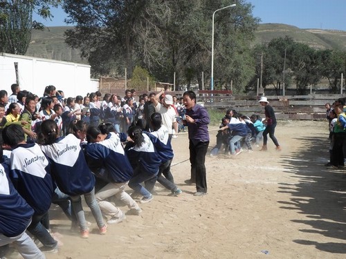 “加油!加油!” 9月28日上午,我校的操场上传来拉拉队一阵阵的呐喊助威声,这是学校正举行“迎国庆”学生拔河比赛。