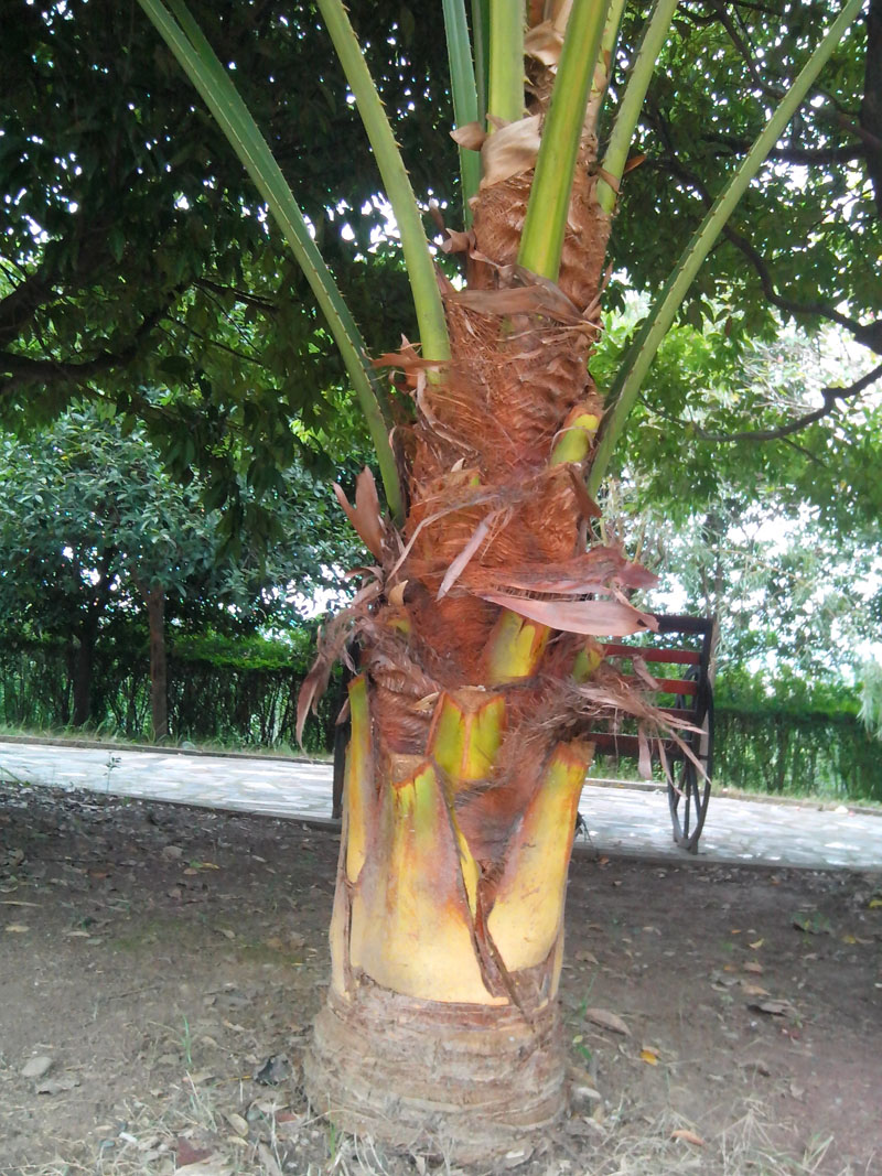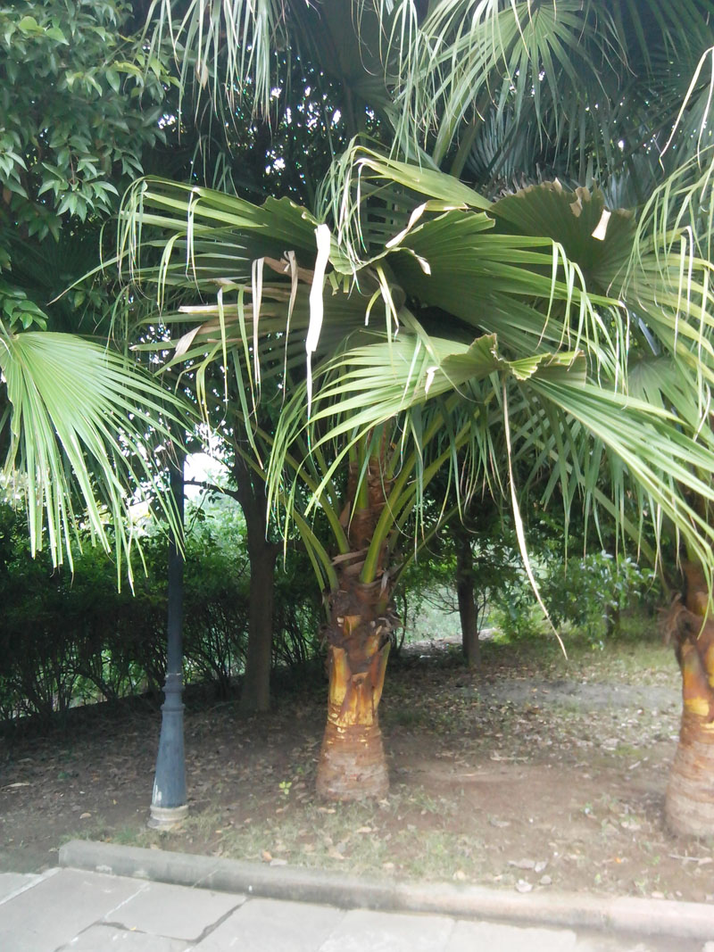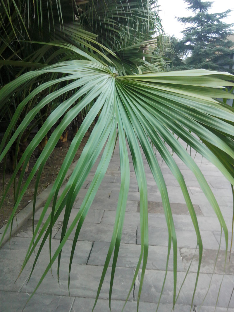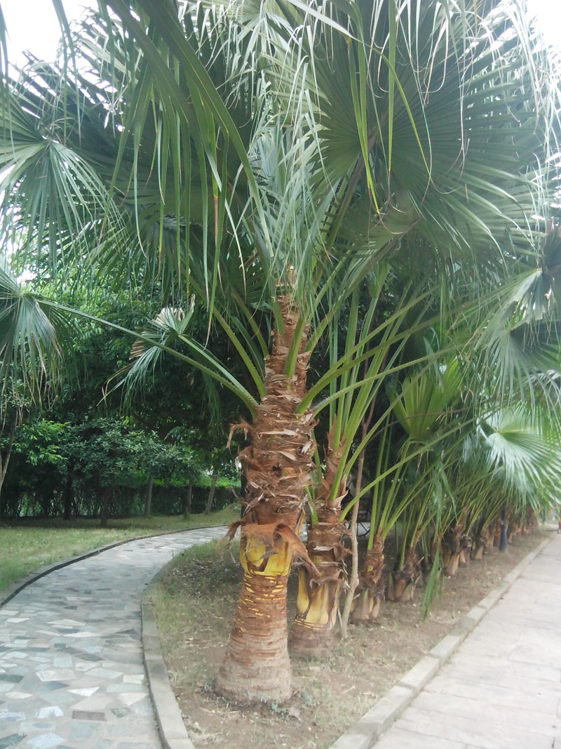 棕榈树的枝干粗壮,最有特色的就是那叶子。叶子近看像包粽子的粽叶,远看像一把把大扇子。叶子的叶脉看不清楚,叶子根部是连在一起的,在望上,就慢慢分开了。一条条的像宝剑一样。叶子碧绿碧绿的,摸起来硬硬的。 那是它们饱经风雨的见证。你可别小瞧它们,它们的用处可多着呢,它们能够用来做成栓肉的绳子,或者是把它们用来当做绳子系东西,便宜又实惠。听说棕榈树全身是宝,所以我们应该多了解了解它们。