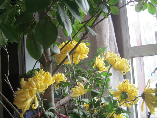 菊花的茎笔直笔直的,叶子是深绿的,花瓣中间是嫩绿色的,大概还没有长好吧。它们有的含苞待放,有的已经开放了,它们的花瓣像一条条金黄色的丝绸,从外往里紧促的围起来,好像在一起说悄悄话呢。
