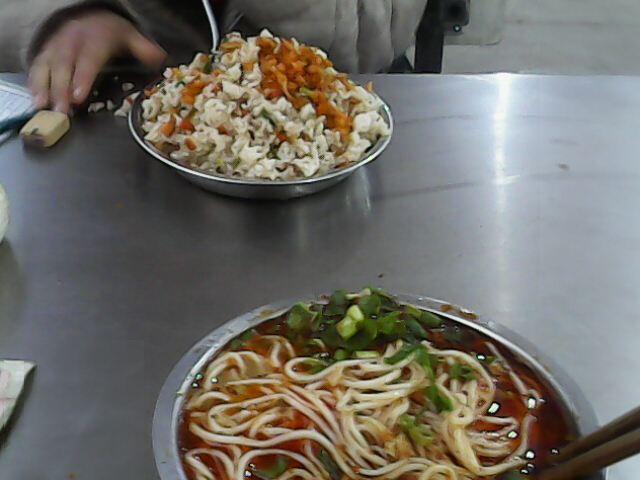 食堂里不只是食物安全绿色,服务人员的态度也特别好,待人亲切和蔼,整个食堂的就餐氛围都是和和气气的。那天早上,我们去的有点晚,面条已经不够一个人的份量。于是我打了一份面条,同学打了一份炒饭。后来有个阿姨说“你那份面条有点少,我再给你个馒头吧?"我应了声:”好的!谢谢阿姨。”