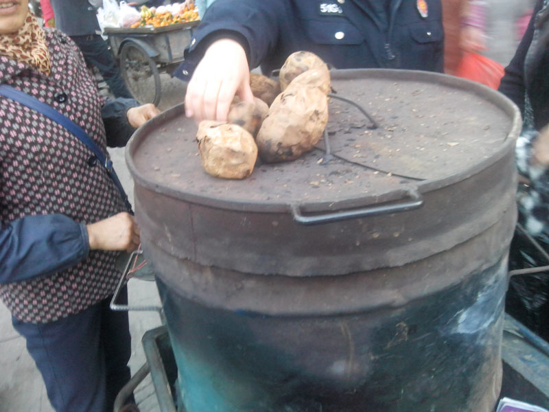 把锅炉放在三轮车上,后面的车兜兜里还放着煤炭,看来,煤炭的威力还是挺大的,没有多久,红薯也就烤好了,将下面烤好的红薯拿到上面一层来卖,中间放着一个小架子,红薯靠着架子,中间一层还在继续烤着,看,红薯烤熟之后,就变成黑黑的了,不错,红薯都快要卖光了。