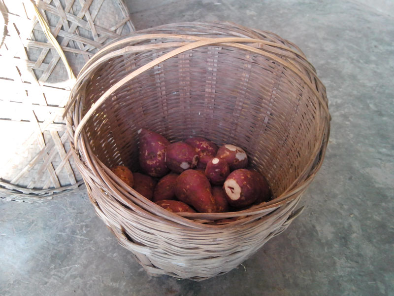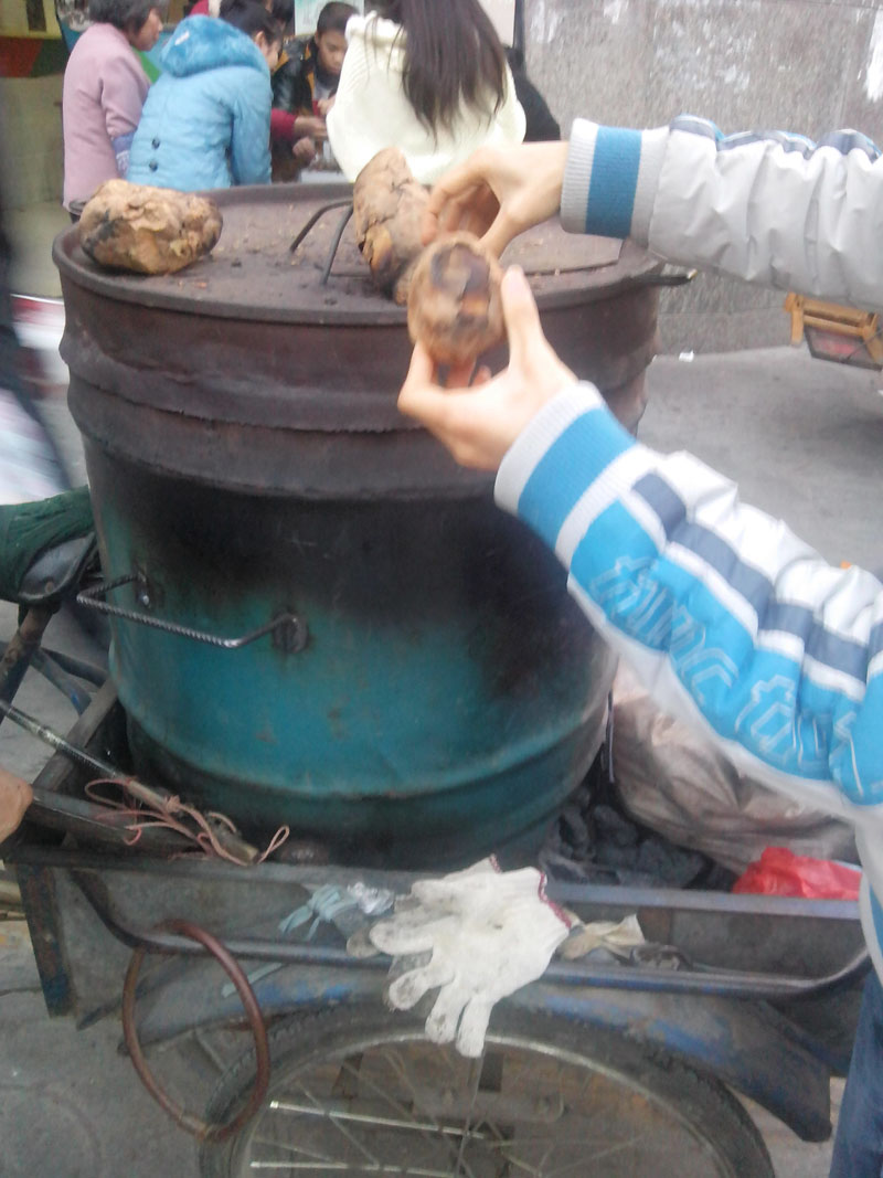 远看,放一个兜兜干什么?走进一看,里面装了红薯,红薯,每次做稀饭的时候,总会放到锅里同米一起煮,煮好之后,饭都是甜的。今天,要这么多红薯做什么?原来,这次不是煮红薯了,是将红薯洗干净了,放在兜兜里得。看,红薯的皮是红色的,把红薯的两边用刀子削了一点,红薯又大又红。哦,是要烤红薯。