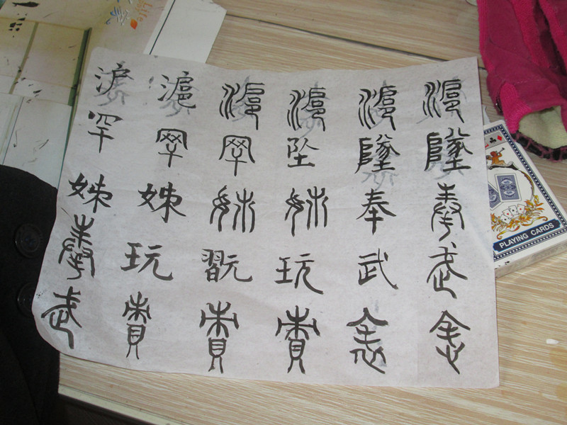 记得那会儿,我总爱看着袁爷爷写毛笔字,那时可能是不舍得钱买纸吧,他总会拿来一些废弃的报纸一类的东西当纸,在上面细心地一笔一笔的写毛笔字,而这个习惯他一直延续到今天。