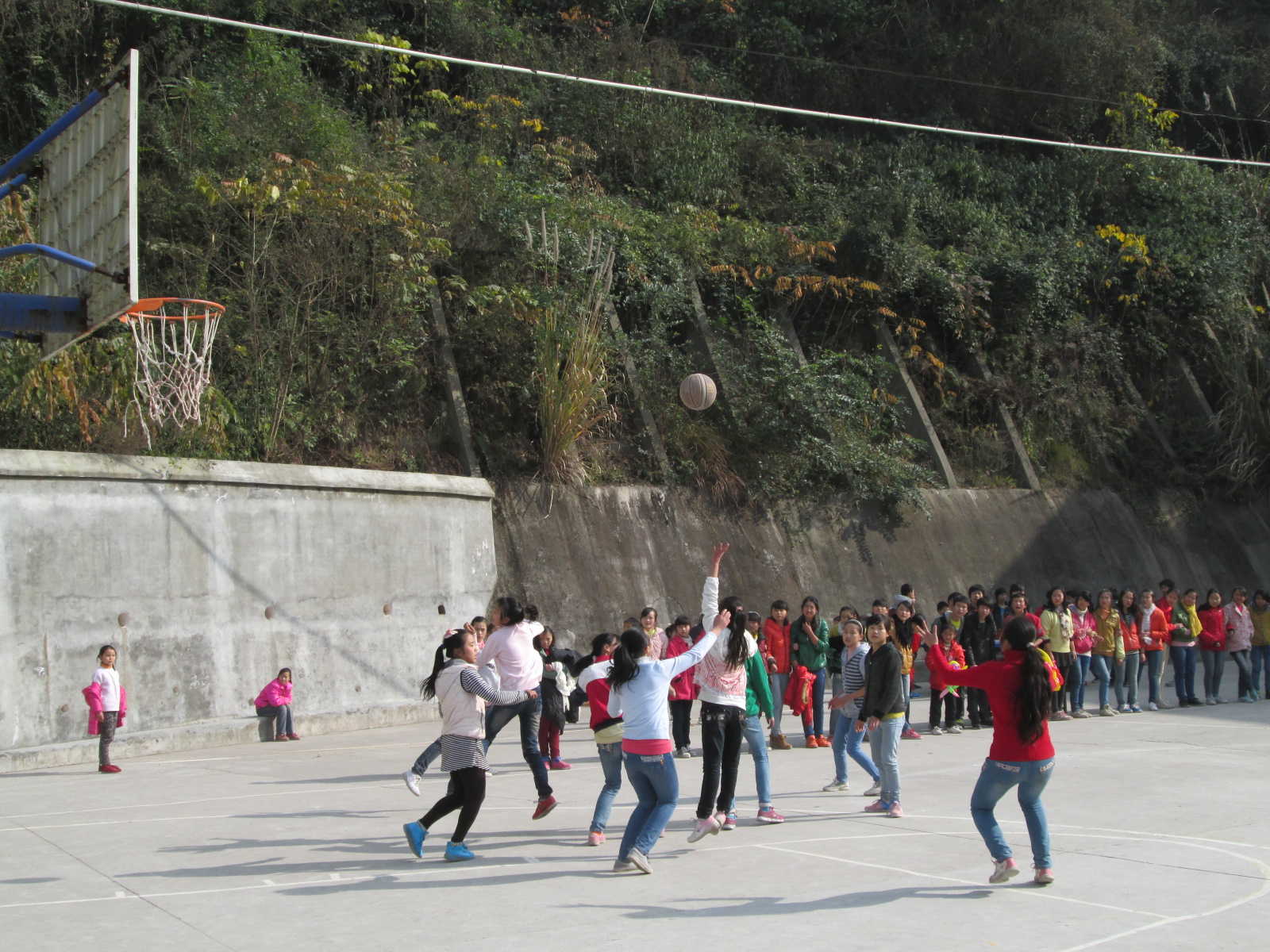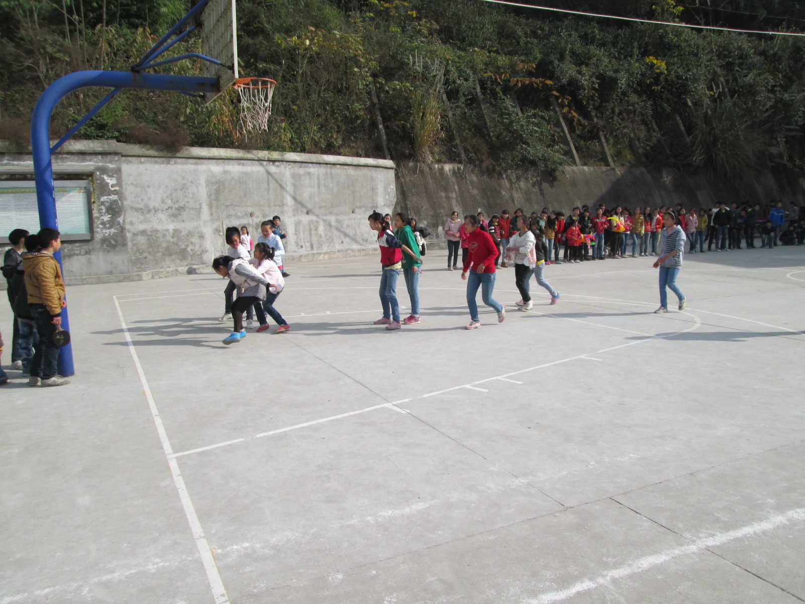 第二场比赛是由一班发球,一位队员用力把球投到了一位一班擅长运球的运动员手里。二班队长安排两个球员守篮筐其余球员都去抢球,抢到球后便死守,二班运动员们个个身怀绝技在这场比赛中各显神通,八一班也是高手如云啊!球进了,操场上顿时爆发出球迷们的呐喊声欢呼声。