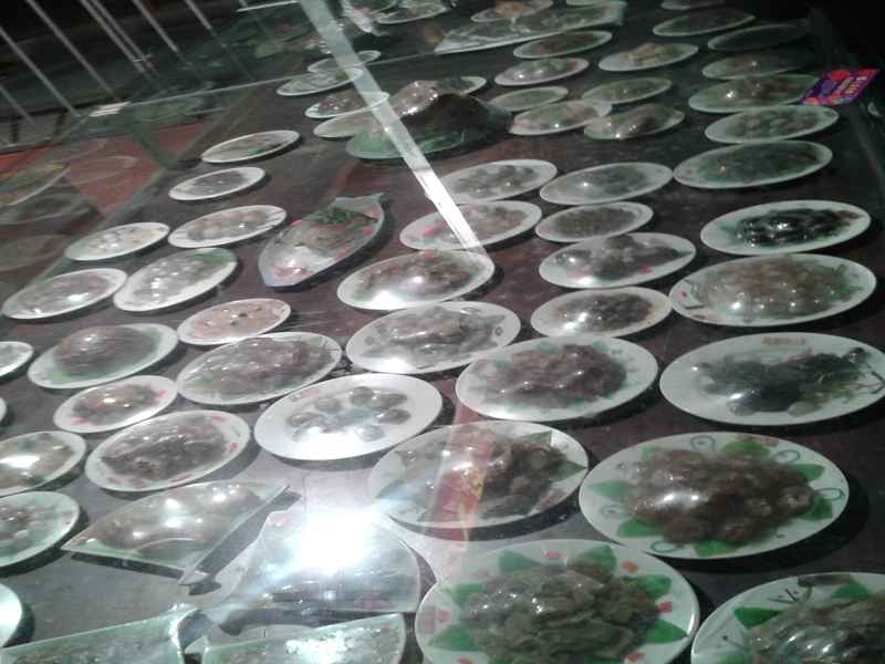 刚走进大门,迎面铺来了一丝雨后的春泥味,突然我的眼前出现了一个玻璃柜,柜中摆放的就是出名的“满汉全宴”。看到我是垂涎三尺,但等我看到尽头的时才发现,眼前的种种美食全是石头做的,真所谓是“美食”变“石头”啊!