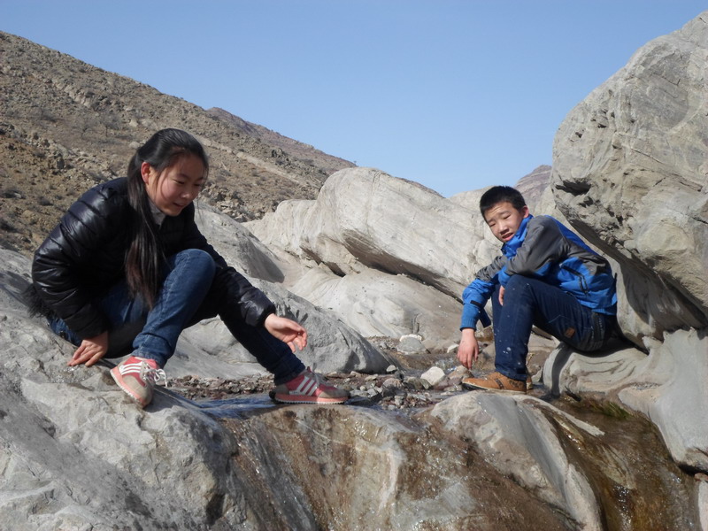山路上有一些比较崎岖的地方,走在上面,一不小心就会崴到脚。在山里山风很大,幸好老爸有先见之明,我和弟弟穿的都很暖和。一路上走走停停手弄得很脏,我和弟弟就去小溪流里洗了个手。虽说水挺冰的,不过一路上蹦蹦跳跳也让我们身上出了不少汗!这雪水正好给我们降降温!!!