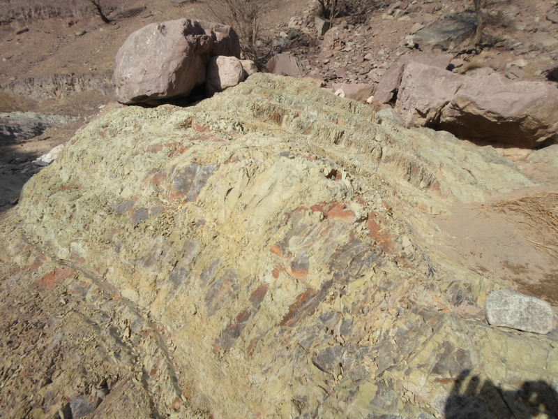 走了没多久,我们看到了一块大的岩石矗立在山脚,他是绿色的,与很多石头都不同,上面有着奇奇怪怪的花纹,看起来很神奇呢!