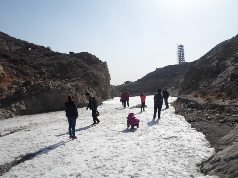 参观完正觉寺,我们开始了我们真正的旅途——爬山——其实并不是真的爬山,只是顺着一条山与山之间的小道顺势往上走。过年的时候下了两天雪,原本已经封冻的小溪上,披了一层薄薄的纱衣。我们走在上面,似乎是在为这件纱衣勾画着最美的图案!