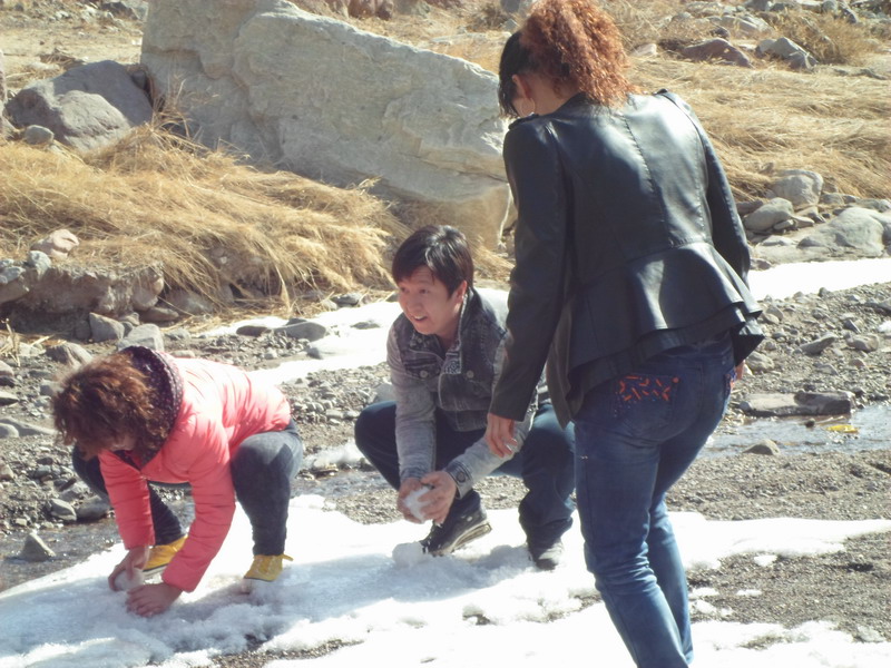 走了一会我们又看到了白白的一层雪,心里顿时玩性大发。舅舅和舅妈以瞬雷不及掩耳的速度捏起雪球向我们进攻啦!虽说是春天,但是由于昼夜温差大,学上有一层薄薄的冰,砸到身上还是蛮疼的。不过大家都玩的很开心,根本没人在乎雪球的冰冷,和被砸的疼痛!