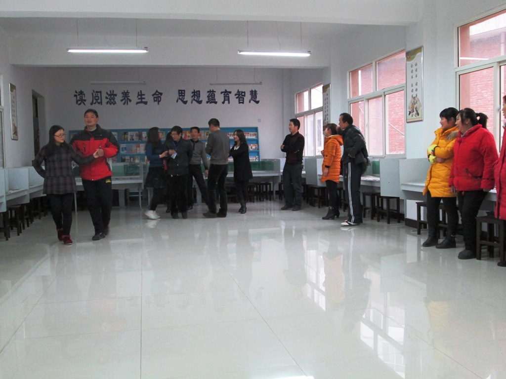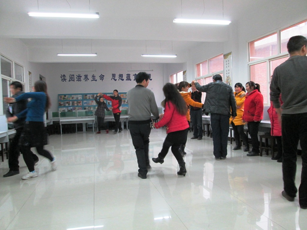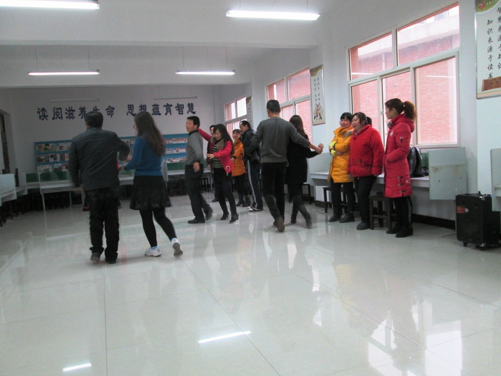 老师们现在正在练习基本舞步,男老师们正拉着女老师们的手在跳来跳去,虽然步伐不够整齐,但也可以算的上是很美了的。