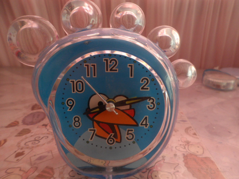 这是一只脚丫状的小钟表,蓝色的脚掌,透明的脚趾,俩条黑色的时分针外加一只银色的秒针。就这么简单地造型,却显得精致、清爽。妈妈告诉我说:“本来想给你个惊喜的,明天早晨让闹钟叫你起床,上了六点的铃声,结果,下午六点它就给响了,科真是负责啊。”其实,下午的六点也足以让我惊喜的!