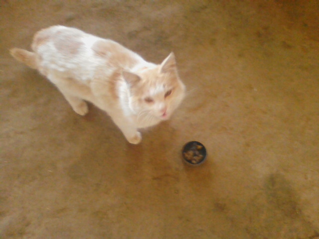 我们觉得它既可爱又可怜,因为它初到这里,一切都在陌生之中,我们对它百般呵护,没过几天我们都互相熟悉了。最引人注目是给它喂食,如果你经常给它喂食,不喂的时候它会一直在你身边喵——喵 ——的叫个不停,好像在说:‘\'小主人,我饿了,’’当你吃饭的时候,它会来到你身边左转右转喊着要吃东西,可怜巴巴的望着你,你不得不给它一些食物。