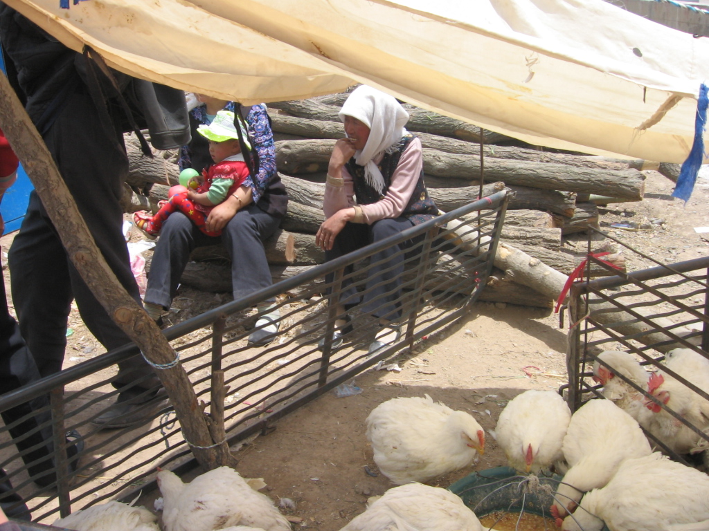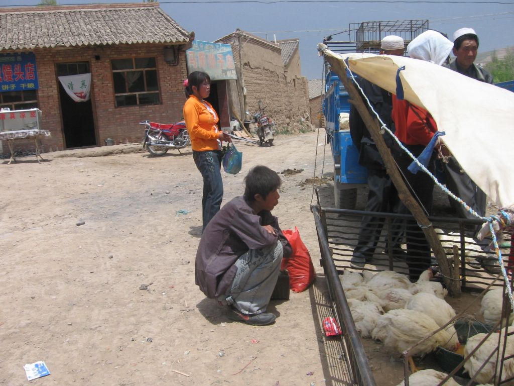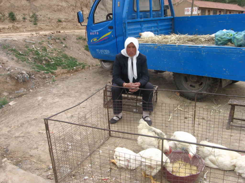 坐着个大婶,她四十来岁,乌黑的头发,圆圆的面孔,一看就知道是个热情爽快的人。她面前放着鸡笼,里面有几只鸡。