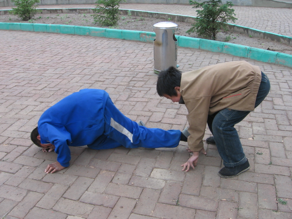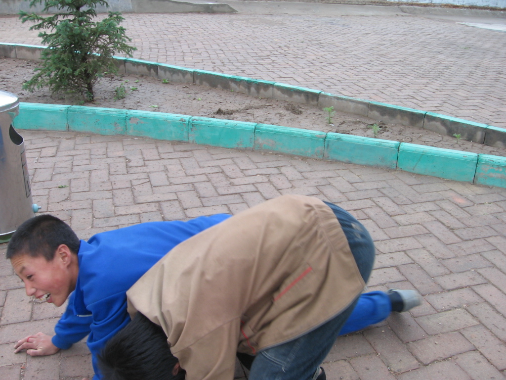 下来是海万平,他那高大的身体,也没有跳,现在才跳,我回头看了看马珍平,他的腿在发抖,我看马珍平复不住了,结果海万平汉没有跳到马珍平的身上时,马珍平已经到了,把海万平拌了个"狗吃屎",我们还没有玩够,已经下课了。
