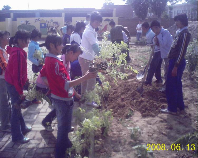 这是我校教师带领全体同学为美化校,他们在烈日下,精心组织学生,往花池里种花草,你看绿茵茵的花草在花池中显得美观而落落大方,使校园变得更加阳光美丽,丰富多彩,实现了花园式学校的梦想。