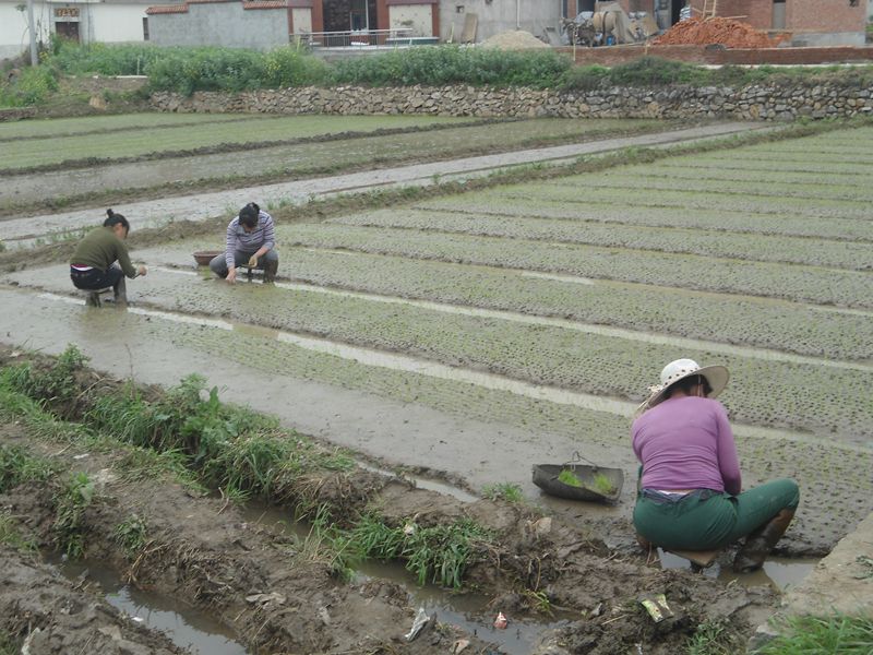 首先,农人们将家中培育好的幼苗拿到田中,然后站在每行秧母板中间,从手中分出一株一株秧苗,低下身子将秧苗一根一根的插进泥里……