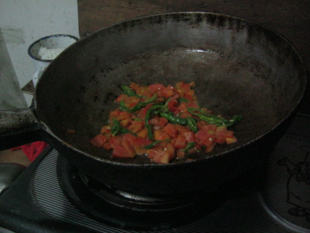 接下来洗菜切菜炒菜。看,我的菜已经在锅里了,虽然不好,但是我很有信心将这顿饭做好。在下饭的时候,我一点一点的下得非常慢,而且面片的形状不是像姑姑那样的方形,长短大小各不相同,不过还好,最后终于全部煮到了锅里,一锅面片做好了!