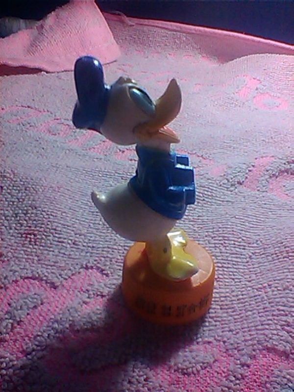 这个“唐老鸭”可神气了。它戴着一个蓝色的海军帽,冒尖高耸,但很像一面蓝色的旗帜,高高在上。它的身上穿着也是蓝色的海军军服。两只小手向前,据我回忆两手中抱着一架手风琴,却被年少无情的‘我’拆了下来。