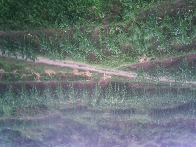 风停了,雨住了,一道彩虹挂在天边,使天空变得格外晴明。树叶上的滴滴甘露,如珍珠般晶莹剔透,地上的小草又恢复了往日的绿意。小鸡、小鸭、小青蛙们也赶趟儿似的出来了,有的在水里嬉戏,有的在对“镜”梳妆,还有的在品尝玉液琼浆,玩累了就蹲着打个盹儿。