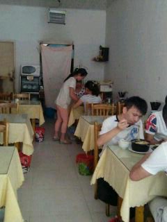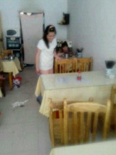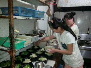 12点了,慢慢的人越来越多,每来一个人,两个人,都要先拿杯子给客人倒水。然后问客人吃什么,客人的菜点完了以后,把菜单给厨房。把菜单给厨房以后厨房就开始做了,过了五分钟饭做好了,放点香菜就可以端给客人了。
