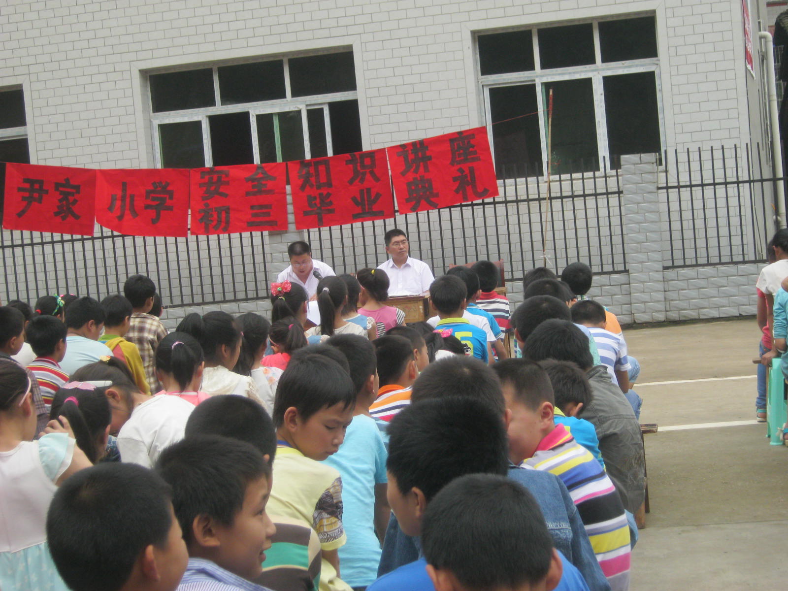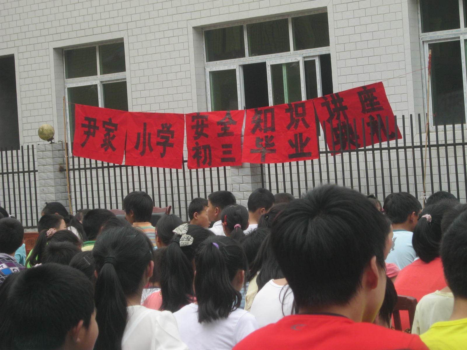 带着疑问我来到了操场。这时只见操场上挂着红色的条幅,上面写着:欢送九年级。我明白了,这是老师们和同学们为我们举办的欢送会。操场上坐着全体师生,红色的条幅在风中摇摆。