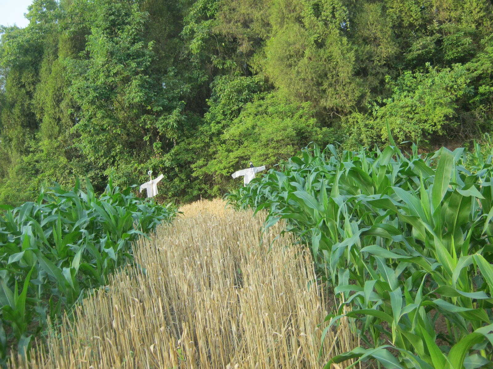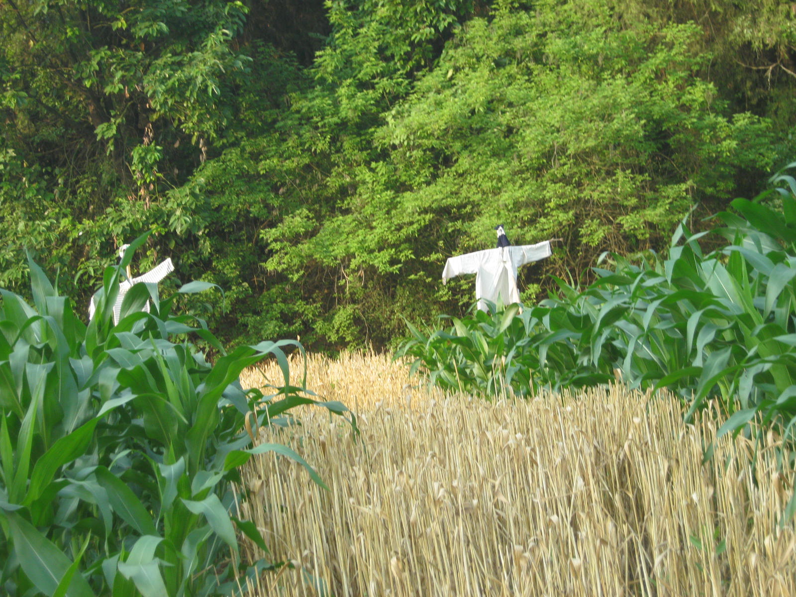 我小的时候还奇怪,大人们为什么要弄这个,又没什么用。直到现在我才知道,这些"人"是来防御小鸟的。我小时候,经常到它的身旁去玩,模仿他那呆呆的动作,跟它有说有笑的。但是它总是呆呆的,一动不动的。
