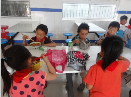 学校的食堂里有很多漂亮的饭桌,橙色的和蓝色的,墙上贴着一首诗和一幅画,诗名叫《锄禾》,这是教我们要珍惜粮食,图上一位老爷爷擦着汗,烈日当空,汗滴禾下土,所以粮食来之不易。
