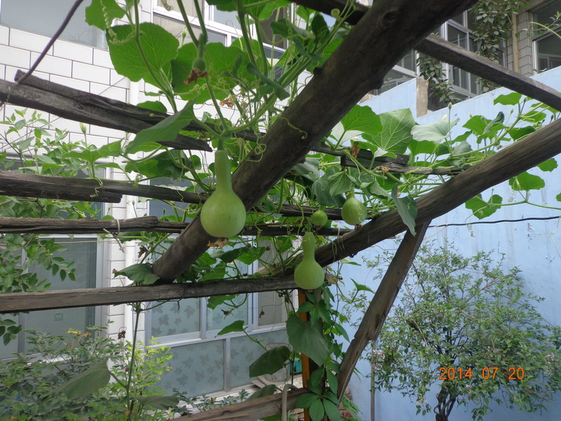 当一株葫芦生长成一定规模时是十分壮观的,葱葱茏茏的绿叶和藤蔓形成了一张大伞,坐在下面十分凉爽。可惜此景只可在清晨还未变得酷热难熬时才可见,一担变成酷暑之日,墨绿色的叶片就会耷拉下来,添了一份慵懒的感觉。