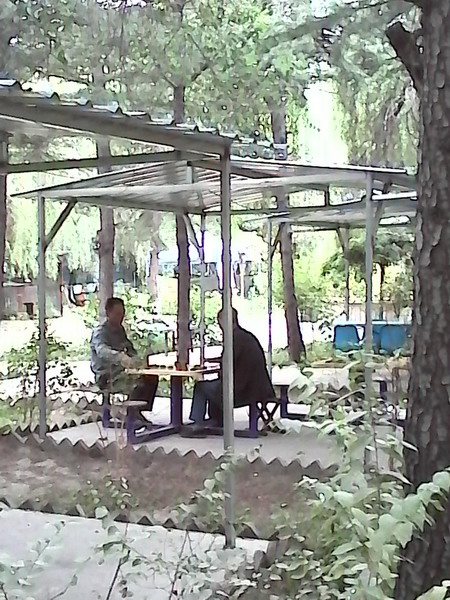 进到大门里面,向左看,有一条小路。路的一边有象棋桌,乒乓球桌,台球桌,还有供老年休息的椅子。看,这有一对老人正下象棋呢!“吃!”听着这雄厚有力地声音,看着其中有一个老爷爷笑逐颜开的对另一个老爷爷说:“怎么样,我又赢了!哈哈哈!”另一个老爷爷不服气的说:“我下把就赢了!”看着他们快乐的玩着,我想,这就是老年人的健康快乐生活吧!