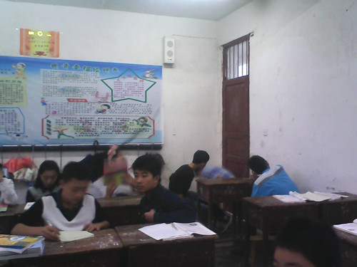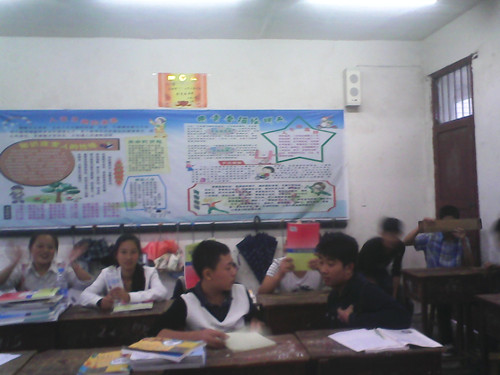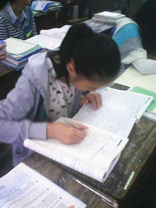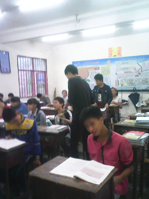更有甚者居然玩起了小孩子玩的游戏来﹕两只小蜜蜂啊,飞到花丛中啊,飞啊,啪啪,飞啊……刚才那宁静的课堂,瞬间烟消云散,不过也有同学在互相抽查作业、听写英语单词……也许这样会缓冲一下初三带来的压力吧﹗这就是我们没有老师守候的一节课,一节既紧张又放松的自习课。
